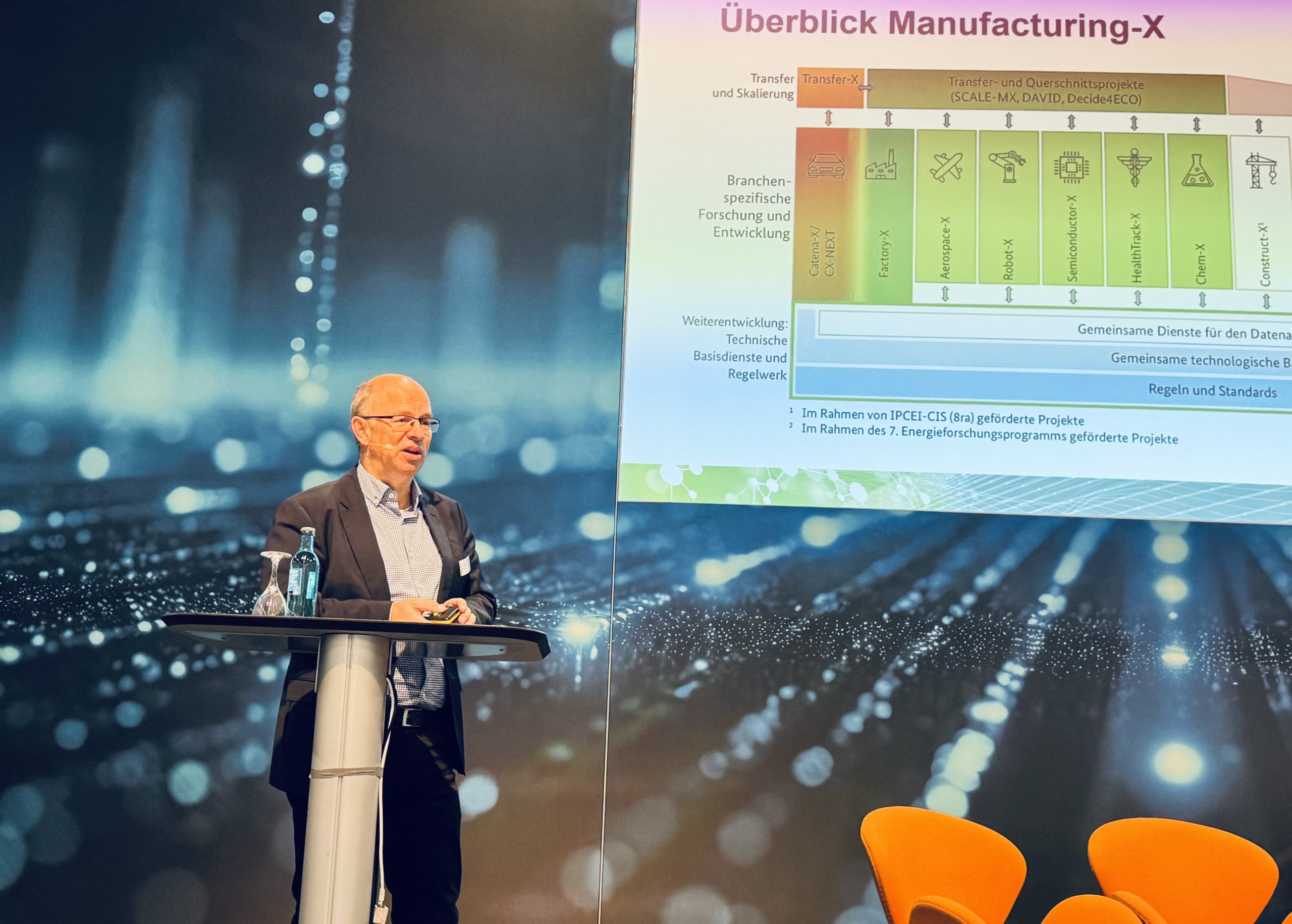 Dr. Marc Hüske stellte in seiner Keynote die Mehrwerte des souveränen Datenaustauschs im industriellen Datenökosystem vor und zeigte auf, wie serviceorientierte Wertschöpfung im Maschinenbau sowie bei Komponentenherstellern im Rahmen von Manufacturing-X realisiert werden kann und welchen konkreten Nutzen der Austausch von Informationen über einen Datenraum hierfür schafft. Er legt klar dar, dass vernetzte Liefer- und Wertschöpfungsketten entscheidend für die Resilienz und Wettbewerbsfähigkeit der Industrie sind und nur eine skalierbare Dateninfrastruktur schnelle, sichere und effiziente Prozesse in globalen Lieferketten liefert.